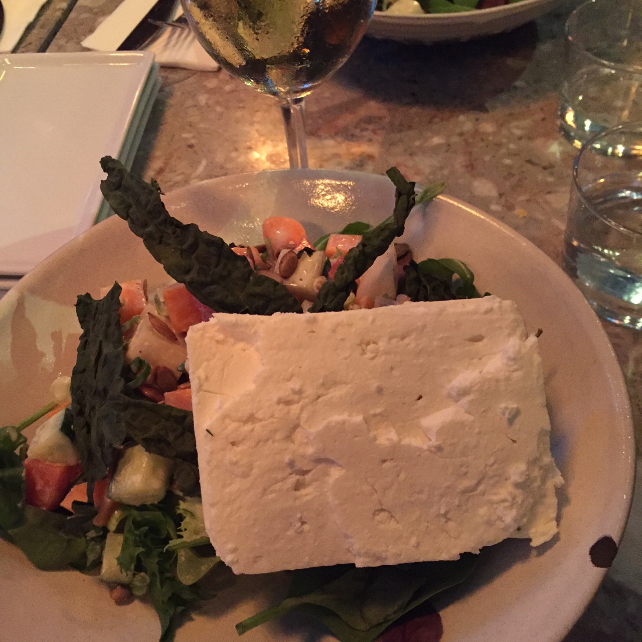 Där under fetaosten skymtar en spaghetti med vitlöksfräst spenat och edamamebönor, i all sin enkelhet.